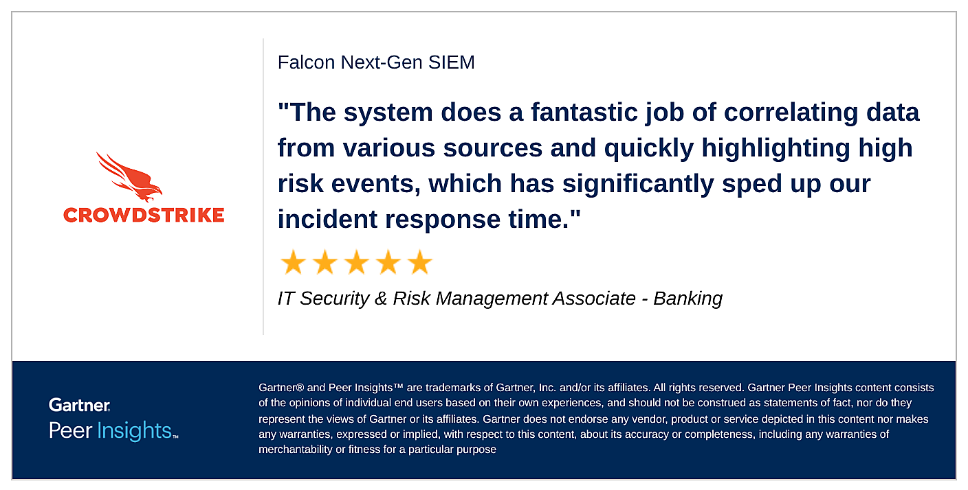 *As of June 2, 2025, CrowdStrike has an Overall Rating of 4.7 out of 5 and the most reviews in a 12 month period in the Security Information and Event Management, based on 184 reviews on Gartner Peer Insights™